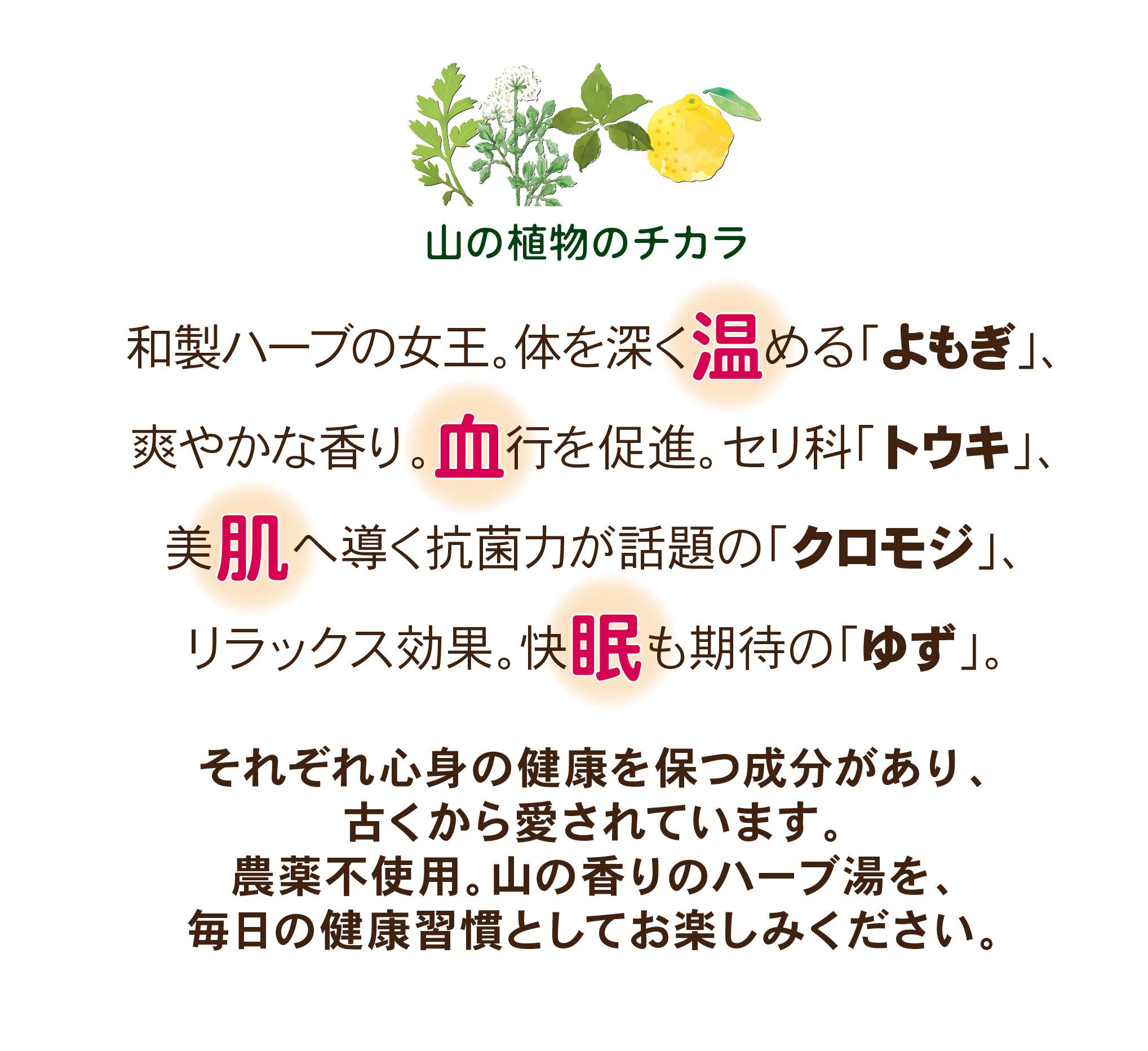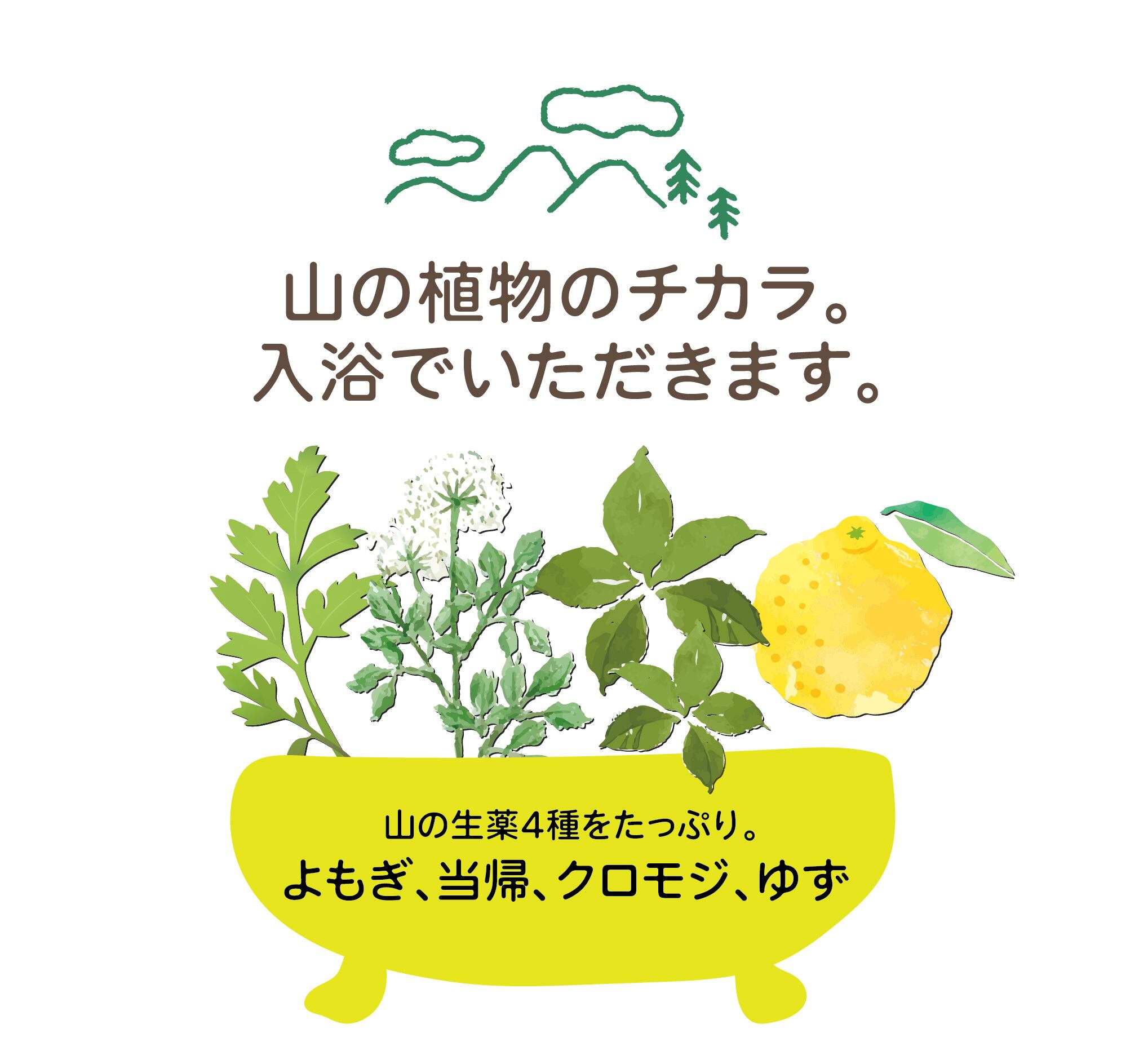 農薬不使用。山の香りのハーブ湯を、